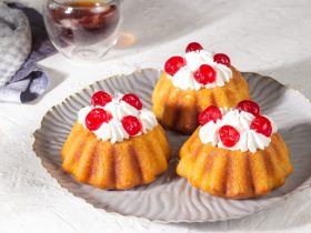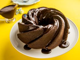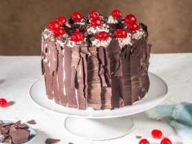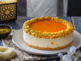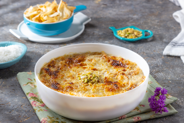 - تضاف القشطه ثم يدخل القالب الفرن لمدة 20 دقيقة ويقدم