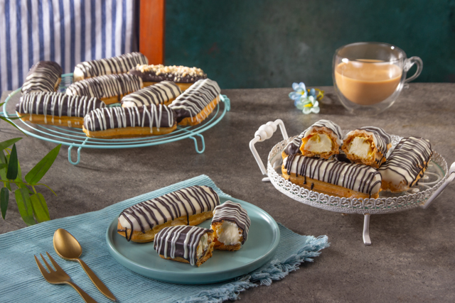 - يضاف الحشو داخل الإكلير ويزين بالشوكولاتة وتقدم باردة بالف هنا