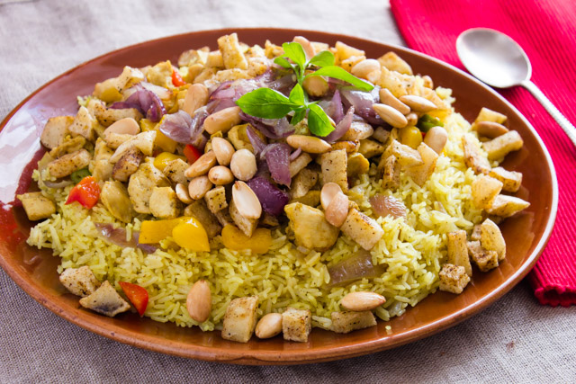 • فى طبق التقديم يتم وضع الارز و عليه خليط الدجاج ثم البصل و البطاطس المقلية و المكسرات على الوجه و يقدم بالهنا و الشفا