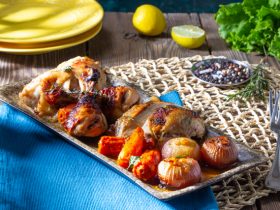 - يضاف الثوم والمشروم و يبهر الكل بالملح والفلفل و جوزة الطيب يقلب المزيج الى ان يصبح لون الدجاج ذهبيا.