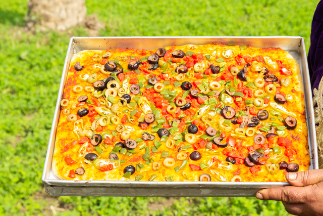 - ونضع عليها الصلصة وتزين بالفلفل الالوان والزيتون