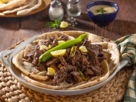 - في طاسة اخري يوضع الدقيق و يضاف الحليب المغلي و تضاف شوربة اللحم