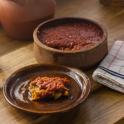 - نضع بصل وثوم ونشوح الجميع ونضيف ملح وفلفل أسود و خل العنب وعصير العنب ونغطي ونتركه حتي يكون سميك.