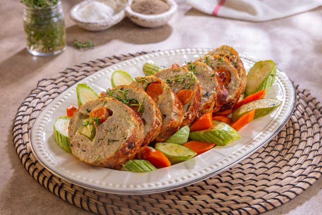 - يوضع الدجاج على الاسترتش و يحشى بالجبن و الخضار و يلف و يسوى في حمام ماء حتى تمام النضج