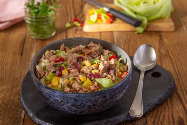 - وضع التونة ,الذرة,الفاصوليا و الفلفل المقطع
