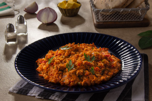 - في طاسة عميقة على النار نضع الزبدة والزيت ثم نضيف البصل ونقلب حتي يذبل ثم نضيف الثوم ونقلب ثم مكعبات الفلفل ومكعبات الطماطم ونقلب