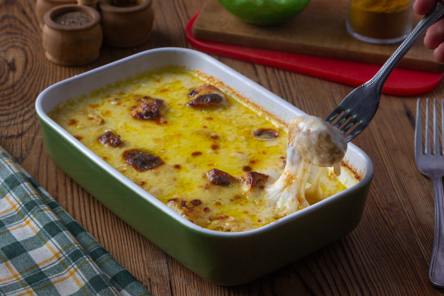 - ثم اضافة الجبن ونقلب ولو صوص الجبن تقيل نخفه بقليل من الحليب ونضيفه على الشيش في الطاجن ثم يدخل فرن سخن حتى يحمر وجه ويقدم.
