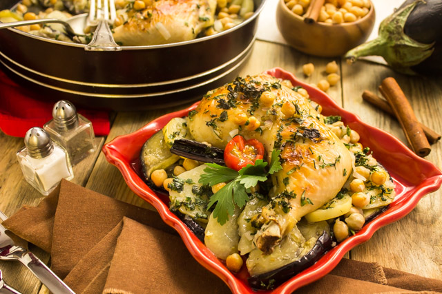 - في صينية فرن ويرص الباذنجان والبطاطس ويضاف لهم خليط الدجاج بالبصل والحمص ثم تتدخل فرن علي حرارة متوسطة لاتمام نضج الدجاج وحتي احمرار الوجه وتغرف وتقدم وبالهنا والشفا 🙂