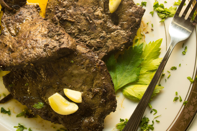 - ثم توضع الكابوريا مع خليط البصل فى صينية و يضاف اليها خل بلسمك و ورق لورى و بابريكا