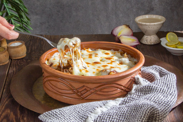 - يوضع علي الطاجن كمية من الصوص ويوضع جبنة شيدر وجبنة موتزاريلا ويدخل فرن حتي يأخذ لون ويقدم ساخن