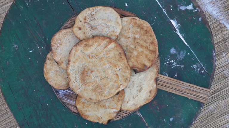 - نفرد القليل من دقيق الذرة على الطاولة ونفرد العجين حسب الحجم الذى نحبه وندهن سمن على الوجه