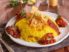 - هدأ من شدة النار وغطي الأرز واتركه يُطهى لمدة 30 دقيقة. قدم هذا الطبق ساخن ومعه سلطة الدقوس.