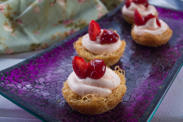 - على النار نضع الفلفل الرومي حتى تأخذ لون بني ثم نضعها في بولة ونغطيها ونقطعها ونرصها على اللحم ونضيف القراصيا والمشمشية والتين.