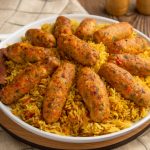 - تصبع الكفتة وترص في الصينية على البصل و الطماطم المشوي ثم تدخل الفرن قليلا