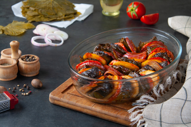 - ندهن صينية و نضع حلقة بصل ثم حلقة بطاطس ثم الكفتة الملفوفة بورق العنب ثم نضع حلقة طماطم