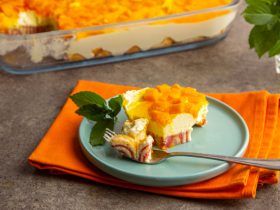 - ثم نضع حبات الفراولة ثم باقي الخليط ونفردها جيدا