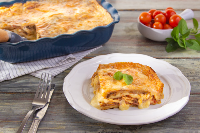 - في طاجن نسكب قليل من البشاميل و نضع رقائق الازانيا ثم قليل من البشاميل و اللحم المفروم و تكرر هذه الخطوة حتى ننتهي من رص الطاجن و نرش على الوجة جبن موتزريلا