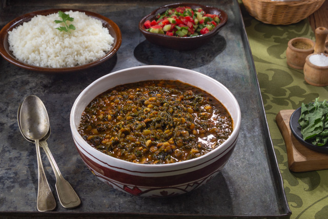 - ثم يسكب عصير الطماطم ومعجون الطماطم مع رشة ملح و فلفل اسود وعن الغليان يتم اضافة السبانخ المغسولة المتقطعة مع الخضروات "سبانخ، شبت، كزبرة".