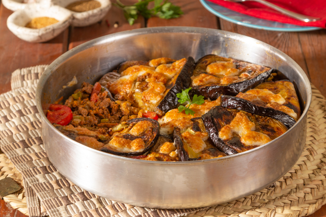 - في صينية نرص نصف الباذنجان وعليه اللحم المعصج وشراءح الطماطم والجبن الموتزاريلا