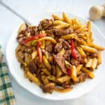 - في نفس الطاسة على النار نضع الزيت ثم نضيف البصل والملح ونقلب ثم نضيف الفلفل الألوان ونقلب ثم الفلفل الحار والمشروم والثوم ونقلب ثم نضيف صلصة الطماطم والذرة ونقلب ثم الصويا صوص ثم شرائح الدجاج والمكرونة المسلوقة ويقلب الخليط ثم يقدم وبألف هنا.
