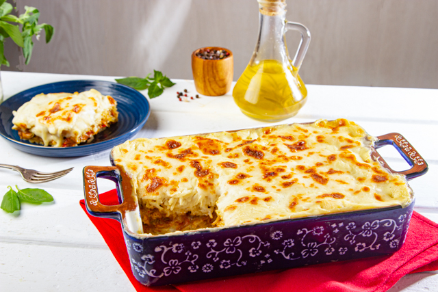 - فى طاجن يتم وضع قليل من البشاميل ثم نصف كمية المكرونة