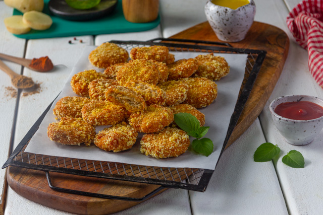 - في مقلاة على النار بها زيت غزير يتم قلي الناجتس حتى تأخذ لون ذهبي