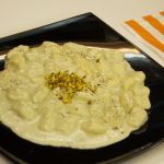 - 7- نرش رشة دقيق خفيفة على عجينة البطاطس 8- نضع مكعبات العجينة فى الماء المغلى .. ونتركها حتى يطفو 9- عند الطفو نرفعها بمقصوصة .. ونصفيها من الماء