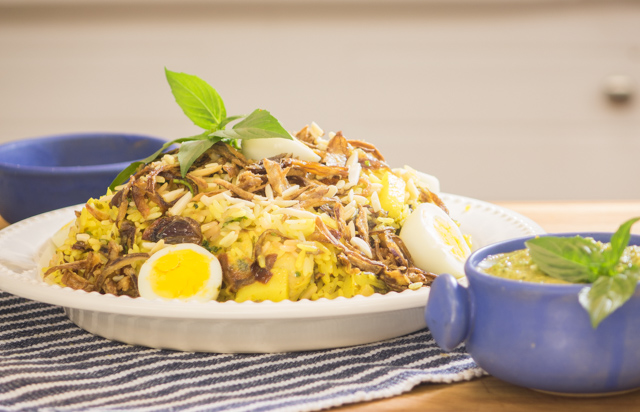 - يوزع الرز على الدجاج بالتساوي، يغطى بالبصل المكرمل