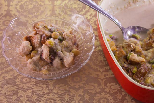 - فى قالب الفرن نضع التوست ونضع فوقه اللبن ثم الزبيب والمكسرات