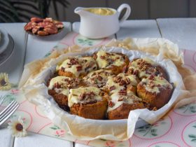 - تترك لترتاح لمدة 10 دقائق وتدخل الفرن لمدة 30 دقيقة (او حتى يصبح لونها ذهبي).