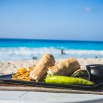 نموذج في ثوب السباحة على خط بيكيني الشاطئ