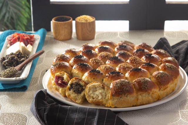 - ونقوم برش حبة البركة علي كرات الجبن، الزعتر علي كرات البسطرمه ، والسمسم علي كرات الزتون المفروم