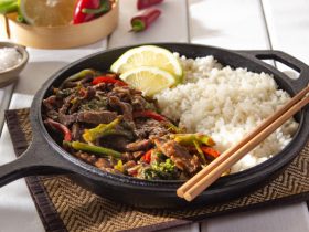 - اضافة السوداني و الصوص و البصل الاخضر يتم تشويح المكونات معا، و يقدم على الارز الابيض.