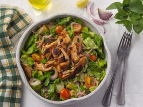 - ثم نضع عليها الفاصوليا والخس وجزء كبير من الصلصة ثم الطماطم والبيض والباقي من الدريسنج "الصوص".