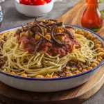 - نضع الصوص في طاجن ثم نضيف فوقه حلقات الخضار بشكل دائري