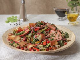 - نقلب زيت الزيتون مع ملح و فلفل اسود و زعتر و نضعهم فوق الخضار