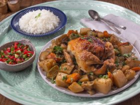 - يضاف التوابل وبعد التحمير يضاف الثوم ثم صويا صوص ودبس الرمان