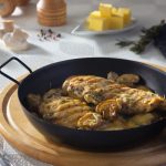 • في طاسة ملعقة زيت ثم نضع الدجاج ويتبل ويشوح حتي يأخذ لون ذهبي ثم يرفع في طبق جانبي .