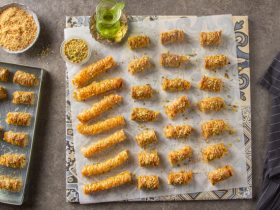 - الي ان يصبح لونها ذهبى جميل ونقطعها الي مربعات ونغرقها بالعسل وبالف هنا