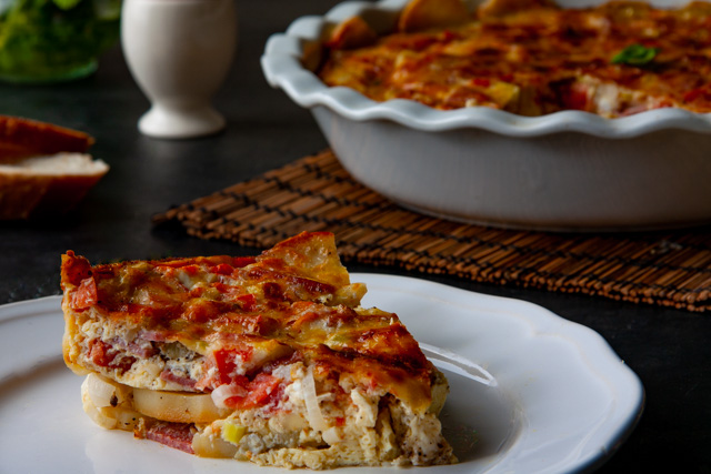 - في بولة نضع البيض ونضربه ثم نضيف الحليب والطماطم والبصل الأخضر واللانشون السلامي والثوم البودرة ونقلب جميع المكونات