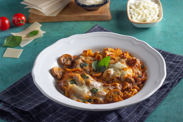 • غطي المقلاة واتركي الاكلة تنضج على نار متوسطة منخفضة لمدة ٢٠ إلى ٢٥ دقيقة ، أو حتى تنضج اللازانيا