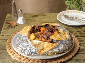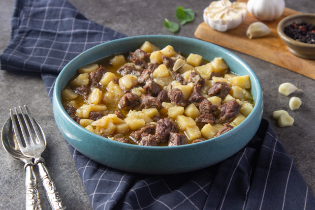 - اضافة التوابل ملح و فلفل اسود ونقلب قبل ما نطفي عليها نضيف مكعبات البطاطس المحمره عليها وتقدم