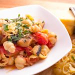 - نقطع الباذنجان الى مكعبات صغيرة ثم نضعه فى طاسة مع الثوم والبقدونس ويحمر جيدا ثم نضيف الطماطم ونتركه حتى ينضج جيدا
