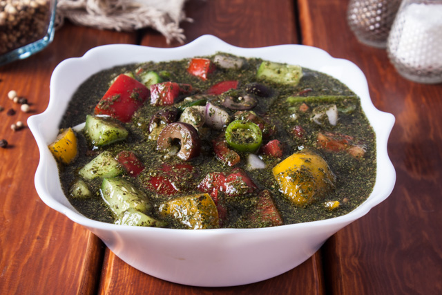 - تقطع جميع المكونات وتوضع في بولة ثم نضع عليها الملوخية ونبدأ في خلط جميع المكونات بالماء ونقلب حتى نحصل على السمك المطلوب.