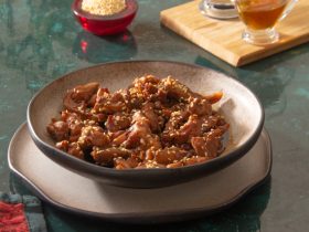 - يرفع من على النار ويترك يبرد ثم يزين بالعسل و الموز و الفراولة