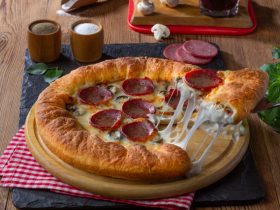 - وفي صنيه فرن قصيره الحافه وياريت تكون صنيه تارت تدهن وتوضع اول طبه من الفطيره وتدهن بالكاتشب واضافة الحشو مع الجبن ثم تغطى بالطبقه الاخري وتقسم من اعلي دون الوصول للحشو ويدهن الوجه وترش حبة البركه