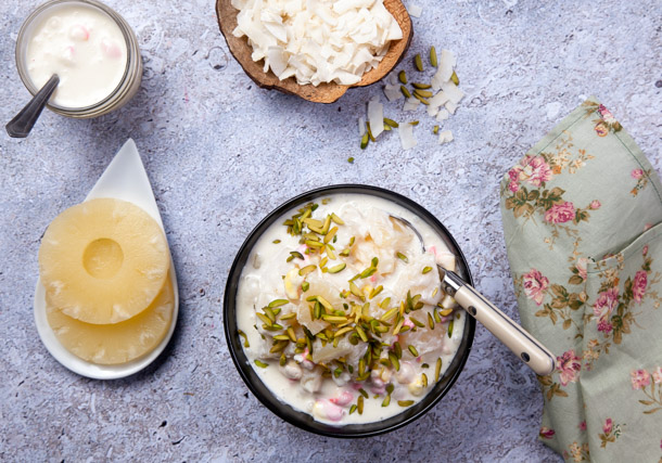 Print Pin سلطة البيناكولادا مطبخ حلويات, سلاطات, وجبة الافطار, وجبة العشاء مدة الإعداد 10 دقائق دقائق مدة الطبخ 15 دقائق دقائق الوقت الكلي 25 دقائق دقائق Servings 2 المقادير1 باكت بودينج فانيليا1 علبة اناناس كمبوت1 باكت كريمة خفق1 باكت مارشيملو صغير1 ملعقة صغيرة فانيليا1 كوب جوز هند مبشور1 كوب مكسرات1 علبة لبن مكثف الخطواتفي بولة تخلط الكريمة مع البودينج واللبن المكثف وجوز ...