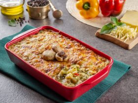 • في صينية الفرن نضع القليل من صوص البشاميل ثم طبقة من الباذنجان ثم طبقة من خليط اللحم المفروم ثم طبقة من الشاميل ونرش على الوجه الجبنة الشيدر وأخر طبقة من البشاميل ونضيف باقي القشطة على الوجه وندخل الصينية الفرن على درجة حرارة 200 لمدة 15 دقيقة ثم تقدم وبألف هنا.