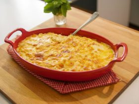 - يضاف الدقيق ويقلب ثم يضاف اللبن الحليب وبعض من ماء سلق المكرونة والقشطة .